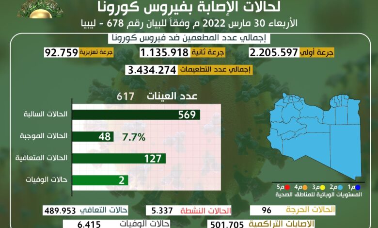 التحديث اليومي للوضع الوبائي المحلي لفيروس كورونا ليوم الأربعاء 30 مارس