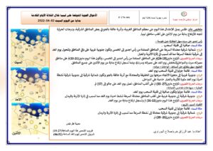 الرياح: جنوبية غربية إلى متغيرة الاتجاه سرعتها بين الخفيفة والمعتدلة مع أتربة عالقة بالجو وتكون شمالية شرقية إلى جنوبية شرقية نشطة أحيانا يوم الغد مثيرة للأتربة والغبار  خاصة علي الدواخل.
