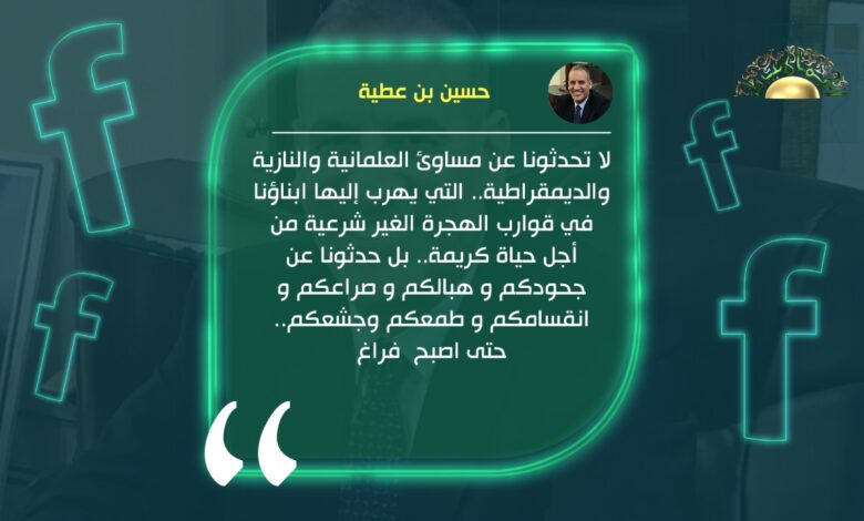 وقال بن عطية في تدوينة له على صفحته على فيسبوك، ” لا تحدثونا عن مساوئ العلمانية والنازية والديمقراطية.. التي يهرب إليها ابناؤنا في قوارب الهجرة الغير شرعية من أجل حياة كريمة.. بل حدثونا عن جحودكم و هبالكم و صراعكم و انقسامكم و طمعكم وجشعكم.. حتى اصبح فراغ.”