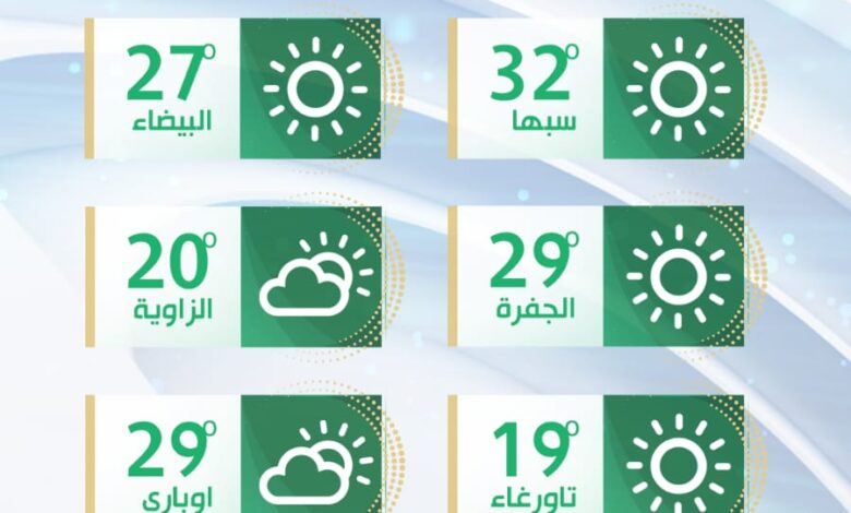 درجات الحرارة القصوى: تتراوح مابين(32- 38)مْ، ولاتتجاوز (25) مْ على الجبل الأخضر وتسجل انخفاض ملحوظ يوم الغد على اغلب المناطق.
