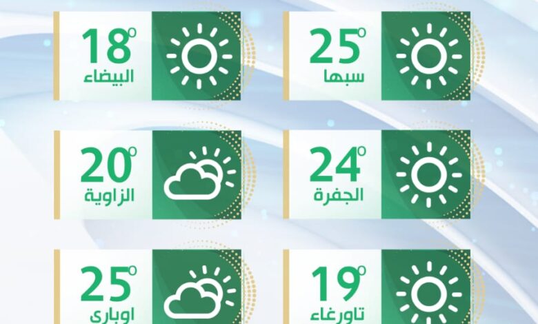أكد مركز الأرصاد الجوية، تأثر أغلب مناطق ليبيا بكتلة هوائية باردة ورياح شمالية غربية نشطة السرعة، تصل أحيانا إلى (50) كلم/ساعة على المناطق الساحلية (خاصة الشرقية)، مع انخفاض ملحوظ في درجات الحرارة اليوم والغد. حيث من المتوقع ان تتراوح ما بين (17-22)مْ على شمال ليبيا، مع تكاثر للسحب من حين لأخر خاصة هذه الليلة وفي الصباح الباكر ليوم الغد مع احتمال بسيط لسقوط أمطار خفيفة وظهور ضباب على بعض المرتفعات الجبلية، ومعظم مناطق الجنوب تكون درجات الحرارة القصوى ما بين (24-30)مْ.