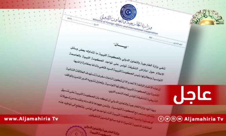 عاجل| خارجية الحكومة المكلفة: هذه الأخبار الزائفة إشاعات مغرضة تستهدف العلاقات الثنائية المتميزة بين الحكومة الليبية ونظيرتها التونسية.