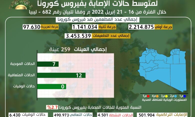 التحديث الاسبوعي للوضع الوبائي المحلي لفيروس كورونا المستجد خلال الفترة من 16-21 /04 / 2022 م وفقا للبيان رقم (682) .