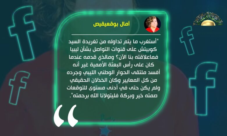 وتابعت: مالذي قدمه عندما كان على رأس البعثة الأممية غير أنه أفسد ملتقى الحوار الوطني الليبي، وجرده من كل المعايير وكان الخذلان الحقيقي، ولم يكن حتى في أدنى مستوى للتوقعات صمته خير وبركة، فليتولانا الله برحمته.