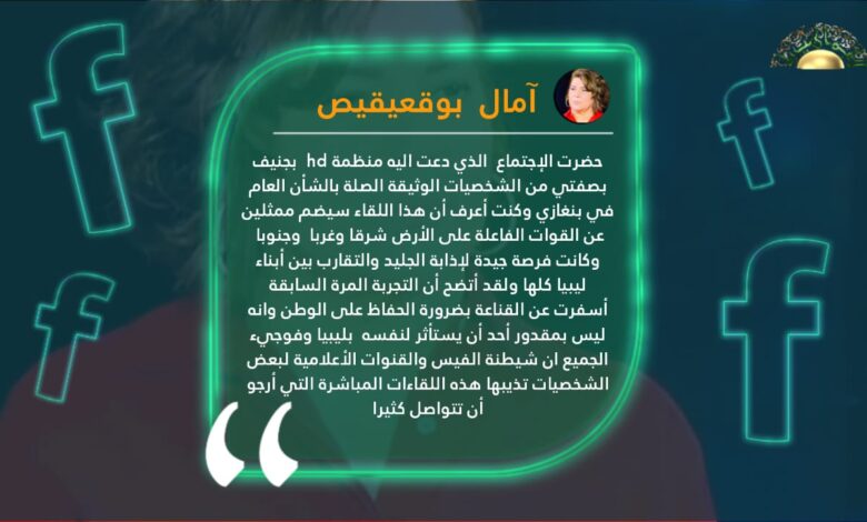 كشفت عضو ملتقى الحوار السياسي، آمال بوقعيقيص، بعضا مما دار في اجتماع سويسرا، وذلك في تدوينة لها على موقع التواصل الاجتماعي فيس بوك جاء كالتالي:-