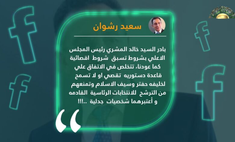 وأضاف: “لكن بادر السيد خالد المشري رئيس المجلس الاعلي بشروط تسبق شروط اقصائية كما عودنا، تتخلص في الاتفاق علي قاعدة دستوريه تقصي او لا تسمح لخليفه حفتر وسيف الاسلام وتمنعهم من الترشح للانتخابات الرئاسية القادمه و أعتبرهما شخصيات جدلية ..!!!”