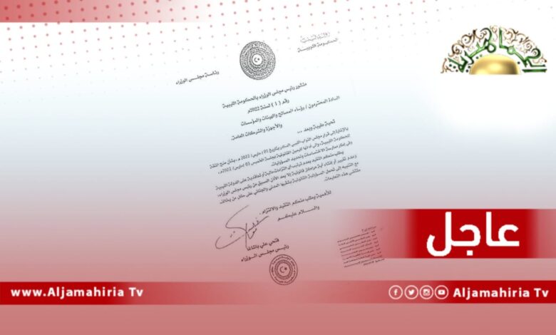 باشاغا يصدر منشورًا إلى رؤساء المصالح والهيئات والأجهزة والشركات العامة يطلب منهم التقيد بعدم ترتيب