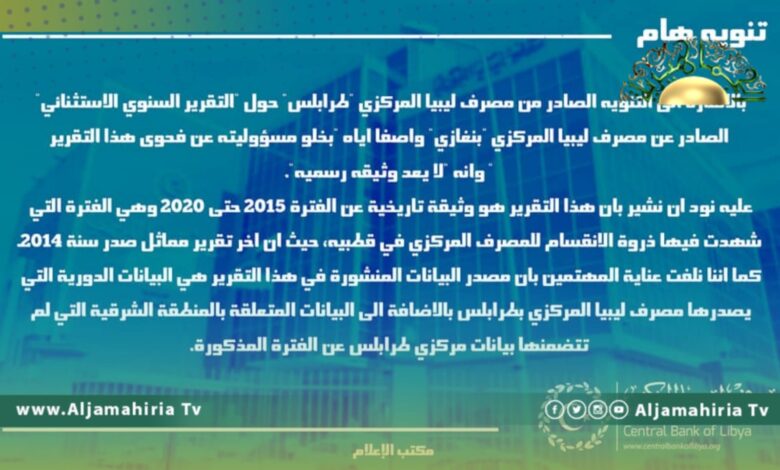 ويذكر أن مصرف ليبيا المركزي، نفي صلته بالتقرير السنوي الاستثنائي عن الفترة من 2015 إلى 2020 الصادر عن فرع بنغازي مؤكدا أنه لا يعدّ وثيقة رسمية ولا يعتد به ويخلي مسؤوليته عما ورد فيه.