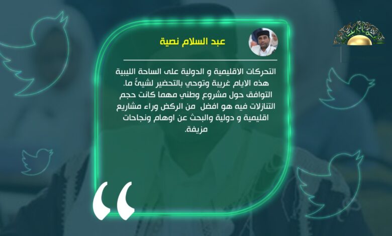 وقال نصية في تغريدة له على تويتر: “التحركات الاقليمية والدولية على الساحة الليبية هذه الايام غريبة وتوحي بالتحضير لشيئً ما”.