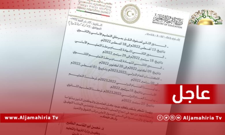 عاجل// وزارة التعليم: بداية العام الدراسي الجديد 2022/2023 لمرحلة التعليم الأساسي 18 سبتمبر ولمرحلة التعليم الثانوي 25 سبتمبر