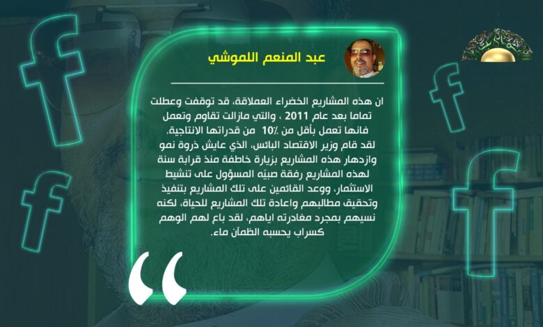 ان هذه المشاريع الخضراء العملاقة، قد توقفت وعطلت تماما بعد عام 2011 ، والتي مازالت تقاوم وتعمل فانها تعمل بأقل من 10% من قدراتها الانتاجية.