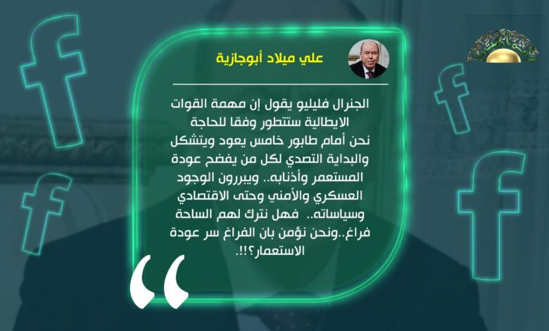 حذر أمين اللجنة الشعبية العامة للإعلام والثقافة سابقا علي ميلاد أبو جازية، من خطر عودة الاستعمار الإيطالي بعد تصريحات الجنرال فليليو.