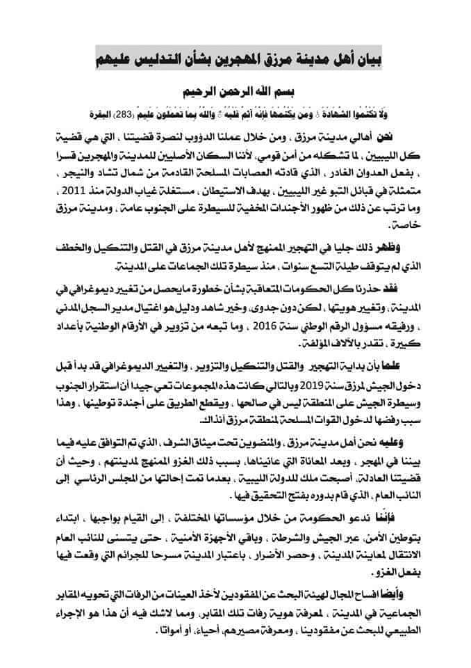 واختتم بيان أهالي مدينة مرزق، أن الجمعية العمومية لعائلات أهل مرزق، تعتبر حق العودة هو حق أصيل لها. وترجوا من السلطات القضائية معاينة المدينة، وحصر الأضرار واستكمال كل التحقيقات، والتعويض وجبر الضرر عما لحق بمدينة مرزق.
