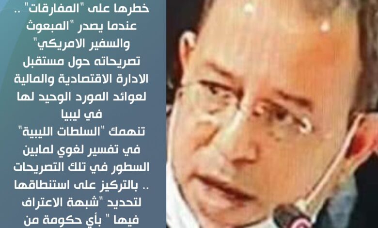 عندما يصدر “المبعوث والسفير الامريكي” تصريحاته حول مستقبل الادارة الاقتصادية والمالية لعوائد المورد الوحيد لها في ليبيا .. المملوك نظريا لشعبها .. ويتجاهل تام للازمة السياسية والاوضاع الأمنية والتدخلات الاجنبية التى سببت في ذلك ..