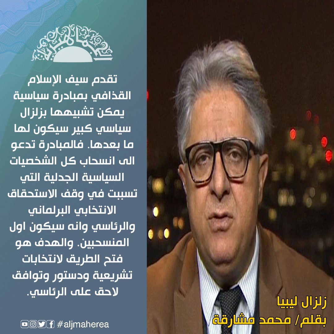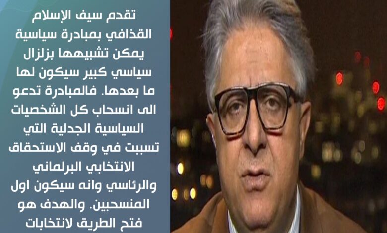 تقدم سيف الإسلام القذافي، بمبادرة سياسية يمكن تشبيهها بزلزال سياسي كبير سيكون لها ما بعدها. فالمبادرة تدعو الى انسحاب كل الشخصيات السياسية الجدلية التي تسببت في وقف الاستحقاق الانتخابي البرلماني والرئاسي وانه سيكون اول المنسحبين. والهدف هو فتح الطريق لانتخابات تشريعية ودستور وتوافق لاحق على الرئاسي.