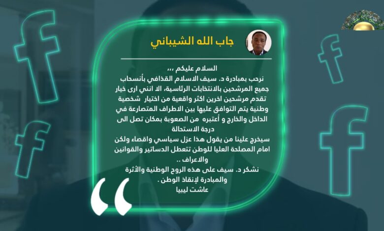 رحب عضو مجلس النواب جاب الله الشيباني، بـ المبادرة التي أطلقها د. سيف الإسلام القذافي، التي تنص على انسحاب جميع الشخصيات الجدلية بالانتخابات الرئاسية.