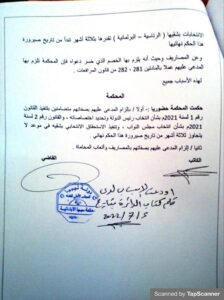 ويأتي هذا الحكم بعد رفع دعوى ضد المذكورين بصفاتهم رقم 9 / 2022 مدني كلي بمحكمة سبها الإبتدائية من قبل المرشحين لمجلس النواب عن الدائرة السادسة ( الدائرة الفرعية )/ وادي الشاطئ ، وناخبين بقوائم الانتخابات باعتبارهم لبيبين ويهمهم الراحة والإستقرار بلادهم، وإجراء الإنتخابات لمصلحة وإستقرار ليبيا وتطبيق القانون.