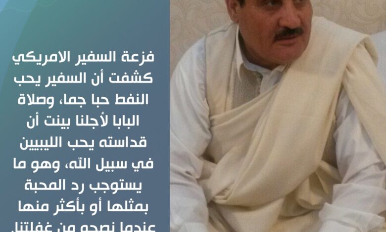 فزعة السفير الامريكي كشفت اكثر ان السفير يحب النفط حبا جما ، وصلاة البابا لأجلنا بينت ان قداسته يحب الليبيين لله في سبيل الله ، وهو مايستوجب رد المحبة بمثلها أو بأكثر منها عندما نصحو من غفلتنا ، ونتعافى من امراضنا النفسية…!