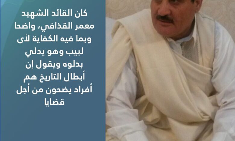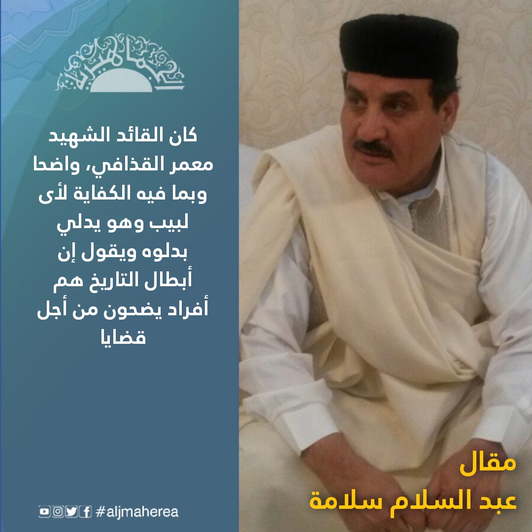 أما القائد معمر القذافي فقد كان واضحا وبما فيه الكفاية لأى لبيب وهو يدلي بدلوه ويقول (إن أبطال التاريخ هم أفراد يضحون من أجل قضايا).