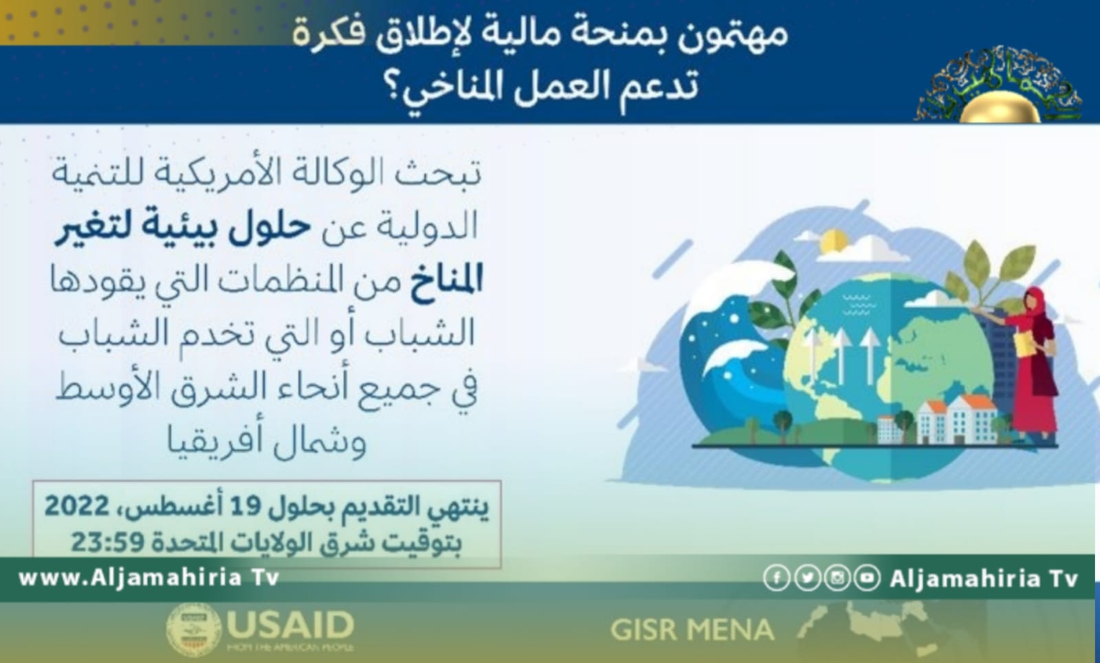 دعت منظمة الوكالة الأمريكية للتنمية الدولية “USAID” المنظمات التي يقودها الشباب وتخدم الشباب من ليبيا لتقديم طلب للحصول على منحة (صدقات) لتعزيز العمل المناخي في منطقة الشرق الأوسط وشمال إفريقيا.