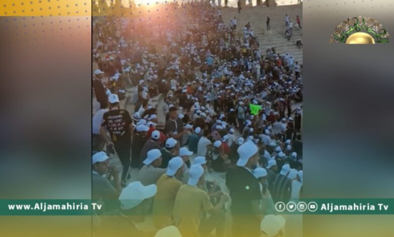 فيدبو / أصوات هتافات المواطنين باسم القائد الشهيد معمر القذافي تعلو مدرجات مسرح لبدة الأثري خلال الاحتفالية التي ينظمها الدبيبة بمناسبة يوم الشباب