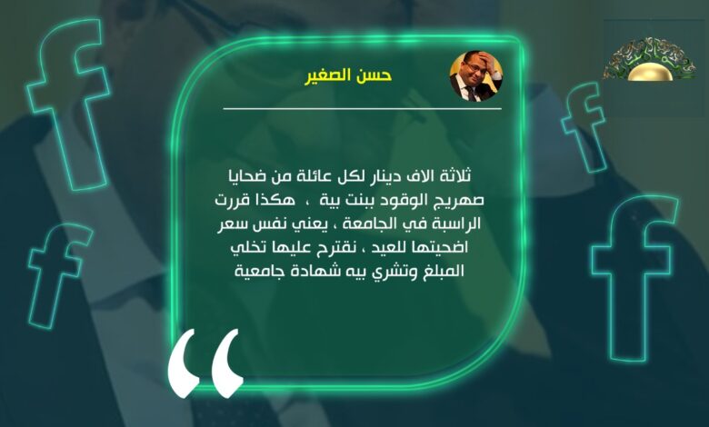 وقال الصغير في تدوينة له على صفحته على فيسبوك، “ثلاثة الاف دينار لكل عائلة من ضحايا صهريج الوقود ببنت بية، هكذا قررت الراسبة في الجامعة ، يعني نفس سعر اضحيتها للعيد ، نقترح عليها تخلي المبلغ وتشري بيه شهادة جامعية”.