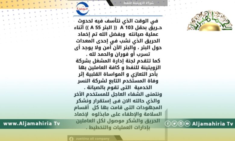 وشددت الزويتينة، في بيان لها طالعته “الجماهيرية”، أن البئر آمن الان بعد إخماد الحريق الذي اندلع أثناء صيانته.