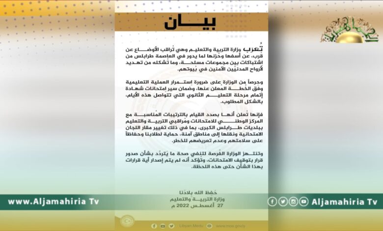 نفت وزارة التربية والتعليم بحكومة الوحدة المؤقتة إصدار أي قرار بإيقاف الامتحانات بسبب الاشتباكات الجارية في طرابلس.