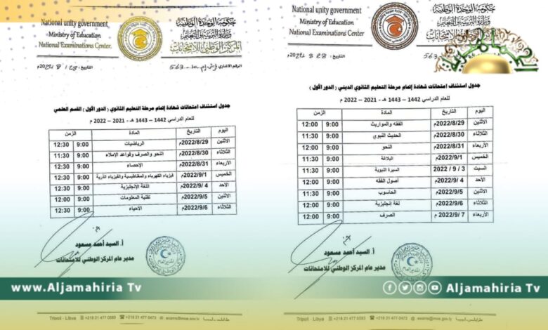 نشرت وزارة التربية والتعليم بحكومة الدبيبة، جداول اِستئناف اِمتحانات شهادة إتمام مرحلة التعليم الثانوي بأقسامها العلمي والأدبي والتعليم الديني – للعام الدراسي 2021- 2022، وذلك في أعقاب الهدوء الذي شهدته طرابلس اليوم، وما تردد عن الاتفاق على انسحاب القوات التابعة لأسامة جويلي.