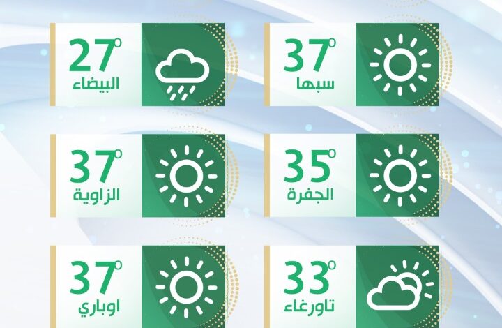 وتسجل درجات الحرارة القصوى على أغلب مناطق الغرب والجنوب مابين (34 – 41 )مْ, بينما تبقي معتدلة على المناطق الشرقية وتتكاثر السحب على مرتفعات الجبل الأخضر قد يصحبها أمطار خفيفة.