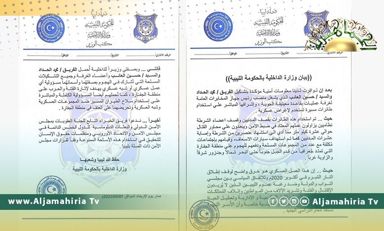 وبحسب البيان، فقد حمل وزير الداخلية عصام أبو زريبة يحمّل الحداد والعائب وأعضاء الغرف وجميع التشكيلات المسلحة مسؤولية أي عمل عسكري أو شبه عسكري يهدف لإثارة الفتنة أو الحرب على منطقة الجفارة، كما يحمّلهم المسؤولية المباشرة على استخدام سلاح الطيران المسّر ضد المجموعات العسكرية وتحريضهما على العنف في المنطقة ذاتها.