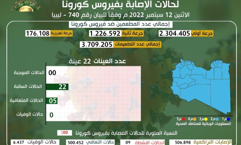 أعلن مركز مكافحة الأمراض عدم تسجيل أي إصابات جديدة بفيروس كورونا، وذلك في التحديث اليومي للوضع الوبائي المحلي لفيروس كورونا المستجد ليوم الاثنين الموافق 12 سبتمبر 2022 م وفقا للبيان رقم (740) .
