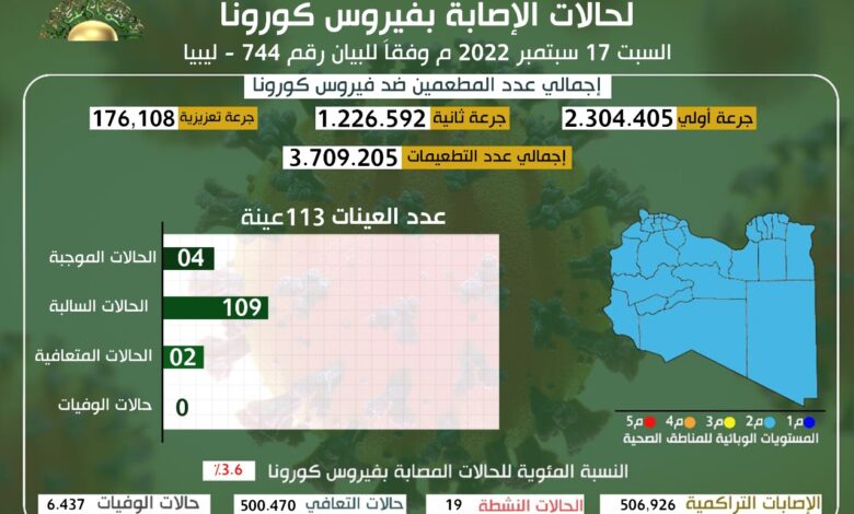 استلم مركز مكافحة الأمراض عدد (113) عينة موزعة على المختبرات التالية : وجاء التحديث اليومي للوضع الوبائي لفيروس كورونا وفقا للبيان رقم (744) كالتالي:-