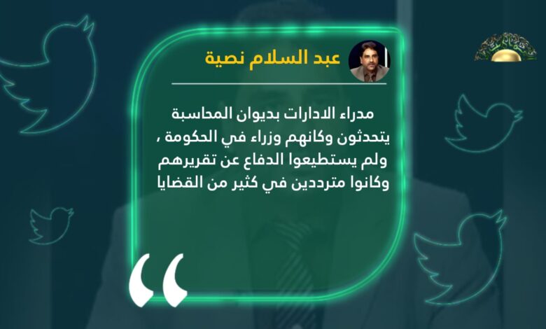 وقال نصية في تغريدة له على صفحته الشخصية على تويتر: “مدراء الادارات بديوان المحاسبة يتحدثون وكانهم