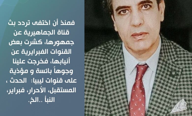 فمنذ أن اختفى تردد بث قناة الجماهيرية عن جمهورها، كشرت بعض القنوات الفبرايرية عن أنيابها، فخرجت علينا وجوهاً بائسة و مؤذية على قنوات ليبيا:  الحدث ، المستقبل، الأحرار، فبراير، النبأ ..الخ.