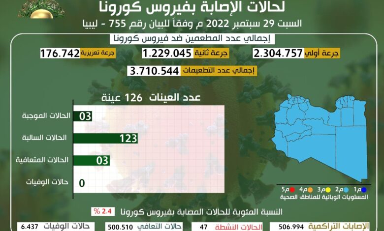 وأوضح المركز في التحديث اليومي للوضع الوبائي المحلي لفيروس كورونا المستجد ليوم الخميس الموافق 29 سبتمبر 2022 م وفقا للبيان رقم (755)، أنه استلم عدد (126) عينة موزعة على المختبرات التالية :