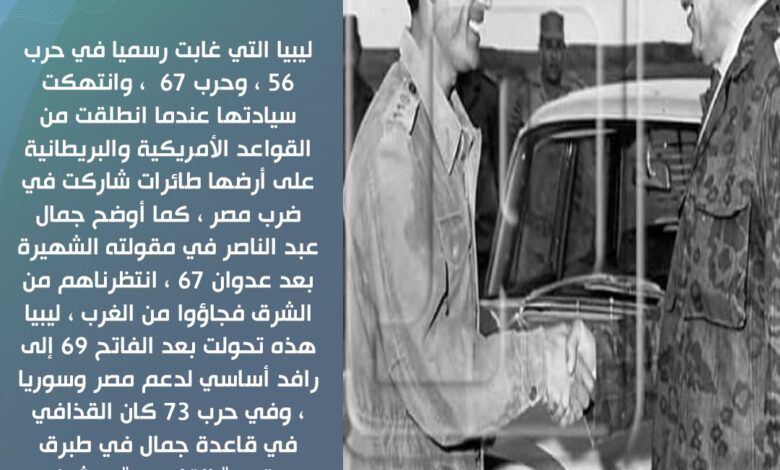ليبيا التي غابت رسميا في حرب 56 ، وحرب 67 ، وانتهكت سيادتها عندما انطلقت من القواعد الأمريكية والبريطانية على أرضها طائرات شاركت في ضرب مصر ، كما أوضح جمال عبد الناصر في مقولته الشهيرة بعد عدوان 67 ، انتظرناهم من الشرق فجاؤوا من الغرب ، ليبيا هذه تحولت بعد الفاتح 69 إلى رافد أساسي لدعم مصر وسوريا ، وفي حرب 73 كان القذافي في قاعدة جمال في طبرق يرتدي ” القامجو ” ويشرف بنفسه على شحن العتاد العسكري إلى جبهة القناة ، ارقام كبيرة جدا تبرز مقدار الدعم السوقي والنوعي الليبي البشري والعسكري والمادي في سبيل تحرير الأرض العربية المحتلة ومجابهة العدو الصهيوني ، وشهادات كل من الراحلين محمد حسنين هيكل و سعد الدين الشاذلي أوضحت التأثير المباشر للأسلحة النوعية الجوية والبحرية والبرية التي قدمتها ليبيا على مسار العمليات الحربية في الجبهتين ، لذلك كان من الطبيعي أن يتم تكريم الشهيد الفريق ابو بكر يونس جابر رئيس اللجنة العامة المؤقتة للدفاع من قبل الرئاسة المصرية بمنحه وسام نجمة الشرف العسكرية ، ولقد وثقت صحيفة الفاتح الناطقة بلسان حركة الضباط الوحدويين الأحرار في بداية السبعينات بالارقام والمعلومات والصور حجم ذلك الدعم الليبي ، واليوم في ذكرى معارك اكتوبر / تشرين لابد من توجيه التحية إلى أبطالها في مصر وسوريا والتحية الخاصة لمصر قيادة وشعبا وجيشا لأن مصر كما قال القائد الشهيد معمر القذافي أكثر من مرة ستبقى مستهدفة دائما من كيان العدو وستبقى دائما ملاذا لأمتنا العربية كما كانت عبر تاريخها التليد.