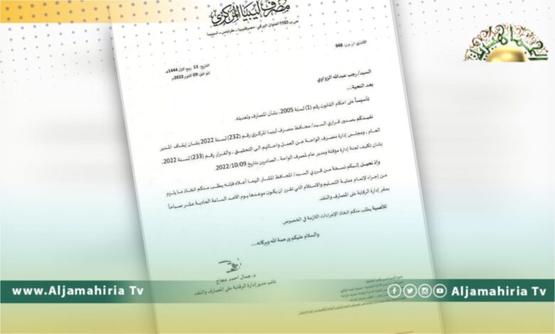وأشار الخطاب الموجه من عجاج إلى رجب عبد الله الزواوي، إلى أن محافظ المصرف المركزي أصدر قرارات بإيقاف المدير العام ومجلس إدارة مصرف الواحة عن العمل وإحالتهم للتحقيق، وتكليف لجنة إدارة مؤقتة ومدير عام لمصرف الواحة.