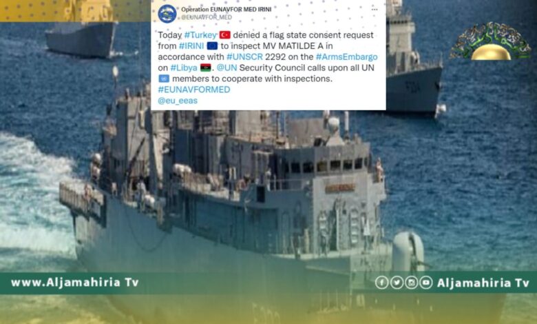 أعلنت عملية إيريني الأوروبية لمراقبة حظر الأسلحة على ليبيا، رفض تركيا طلب تفتيش السفينة (MV MATILDE A) التي تحمل علمها.