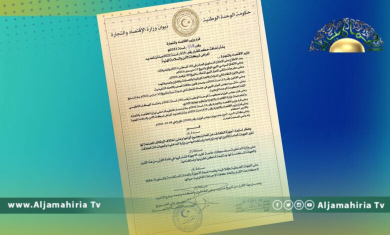 أصدر وزير الاقتصاد والتجارة في حكومة الوحدة المؤقتة، محمد الحويج، قرارا يقضي بحظر استيراد أجهزة الكشف عن المعادن بجميع أنواعها وعلى اختلاف الوظائف المصنعة لها لغير الجهات العامة المأذون لها باستيرادها واستخدامها من وزارة الداخلية والجهات ذات العلاقة.