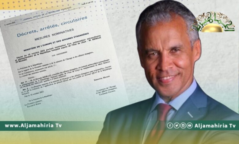 وأوضح ميهراج في تغريدة له على صفحته على تويتر أن المرسوم تضمن تعيينيه كسفير لفرنسا لدى دولة ليبيا.