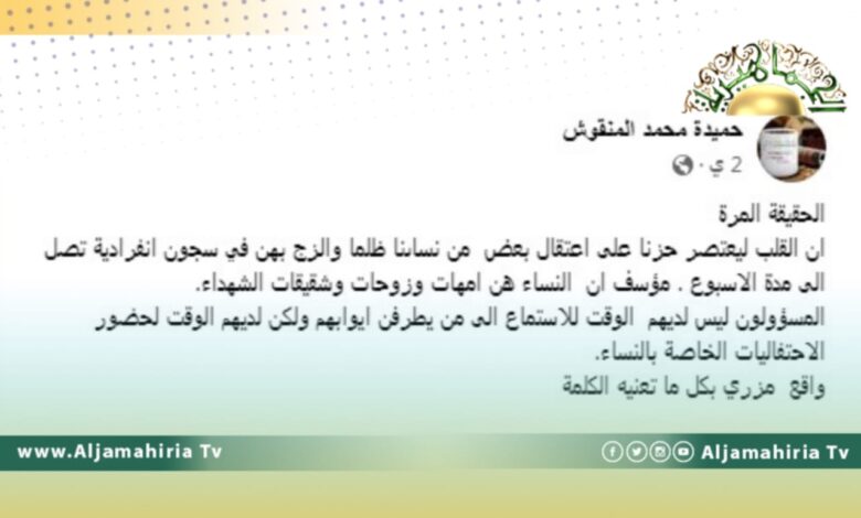 وقالت المنقوش، في تدوينة لها على حسابها على موقع التواصل الاجتماعي فيس بوك، إن القلب ليعتصر حزنا على اعتقال بعض من نسائنا ظلما والزج بهن في سجون انفرادية، تصل الى مدة الأسبوع. وأردفت: مؤسف ان النساء هن امهات وزوجات وشقيقات الشهداء.