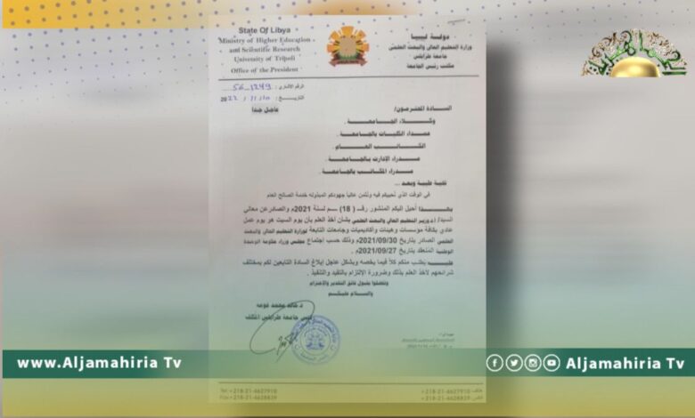 وطالب رئيس جامعة طرابلس، خالد محمد غومة، عمداء الكليات ومدراء المكاتب والإدارات التابعة، بالالتزام بتعليمات وزارة التعليم العالي، وضوروة التقيد بها.