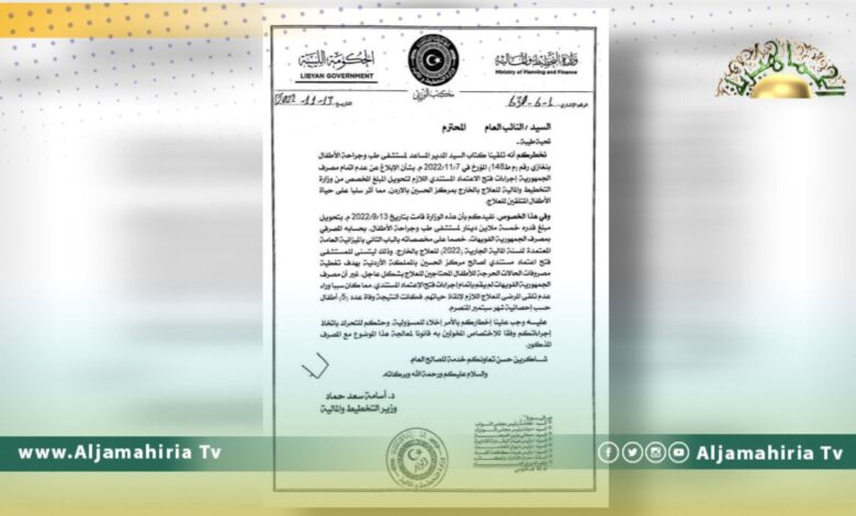 وأشارت الوزارة في خطاب وجهته للنائب العام أنها حولت 5 ملايين دينار لمستشفى طب وجراحة الأطفال بالحساب المصرفي بمصرف الجمهورية الفويهات للعلاج بالخارج، ليتسنى للمستشفى فتح اعماد مستندي لصالح مركز الحسين بالأردن لتغطية مصروفات الحالات الحرجة للأطفال المحتاجين للعلاج بشكل عاجل.
