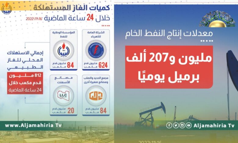 أعلنت مؤسسة النفط أن إنتاج الخام بلغ مليون و 207 ألف برميل , وبلغ إنتاج المكثفات 54 ألف برميل خلال الـ 24 ساعة الماضية.
