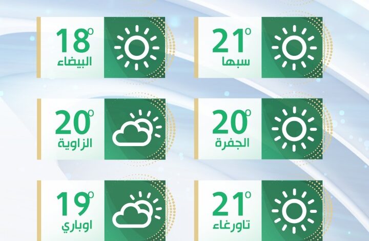 ولا تغير يذكر في حالة الطقس على جنوب ليبيا باستثناء الانخفاض في درجات الحرارة خاصة أخر الليل وفي الصباح الباكر.