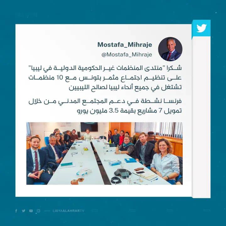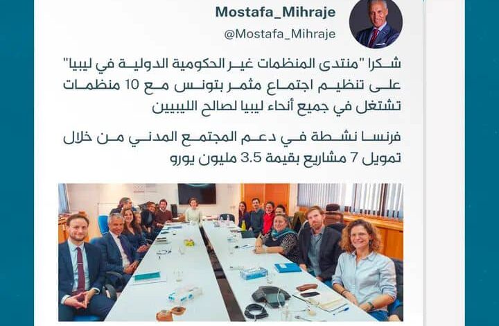 أعلن السفير الفرنسي لدى ليبيا مصطفى مهراج تصدق فرنسا على ليبيا بمبلغ 3.5 مليون يورو فيما قال انه تمويل 7 مشاريع في ليبيا دعما للمجتمع المدني.