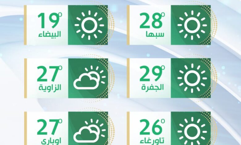 أكد مركز الأرصاد الجوية، وجود أجواء دافئة على اغلب مناطق ليبيا، حيث درجات الحرارة فوق معدلاتها الفصلية لهذا الشهر (ديسمبر)، وتتراوح مابين(23–28)مْ، ولاتتجاوز هذا اليوم(22)مْ على الجبل الأخضروأقصى الساحل الشرقي وتسجل زيادة طفيفة اليومين القادمين خاصةً على المناطق الغربية.