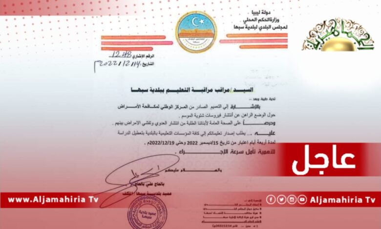 مراقبة التعليم سبها تقرر وقف الدراسة لمدة 4 أيام ابتداء من غدٍ الخميس على أن تستأنف الدراسة الإثنين