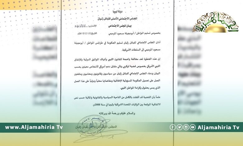 المجلس الاجتماعي الأعلى لقبائل زليتن يدين تسليم المواطن الليبي ابوعجيلة مسعود للسلطات الأمريكية